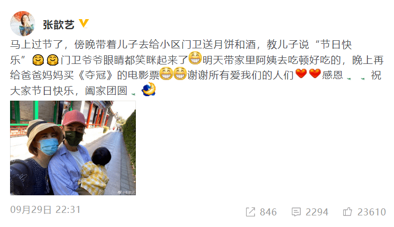 适逢国庆中秋双节将至,张歆艺和袁弘带着儿子一起给保安送月饼。