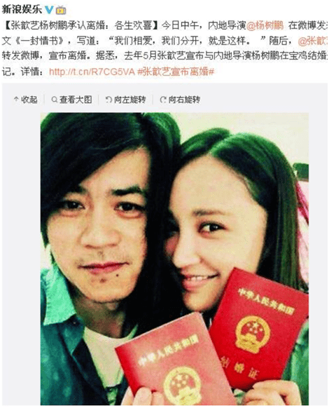 同年10月,张歆艺火速跟导演杨树鹏宣布结婚,这段婚姻开始得很仓促,甚至有种赶鸭子上架的感觉。